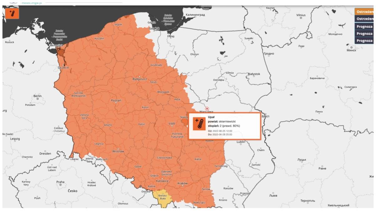 Ostrzeżenie wydano od południa 25 czerwca do 20.00 we wtorek, 28 czerwca. Co dalej? Jak podają synoptycy w środę przejściowe ochłodzenie do około 20°C na zachodzie i w centrum kraju oraz opady deszczu i burze, lokalnie z silnym deszczem.