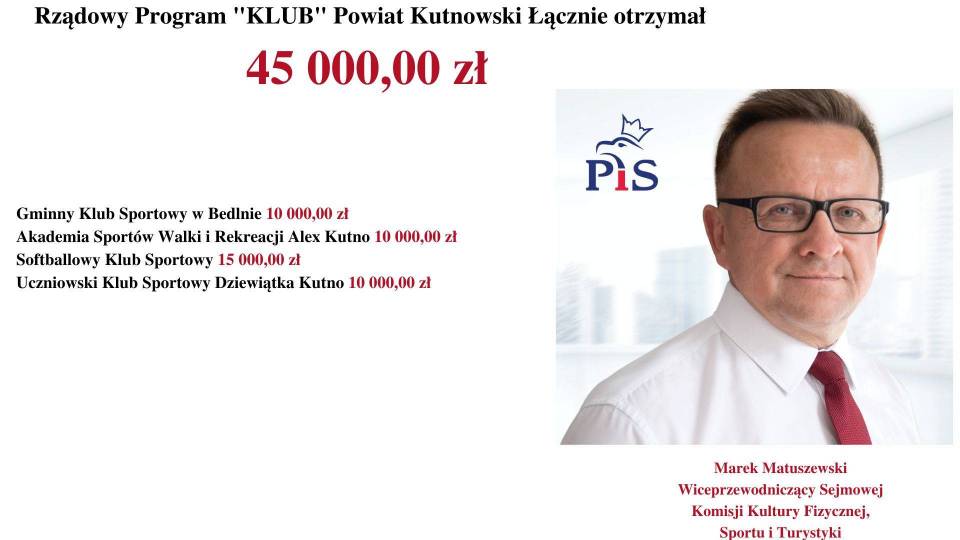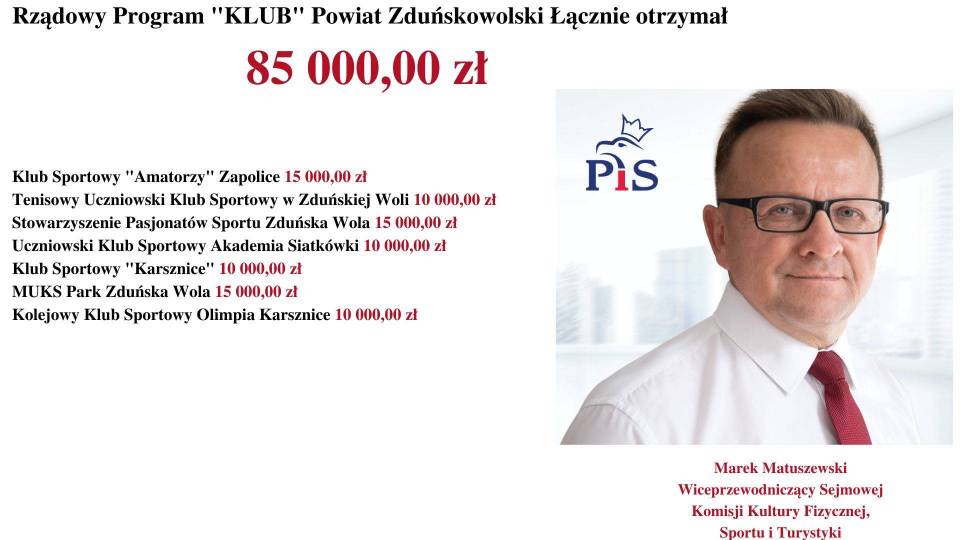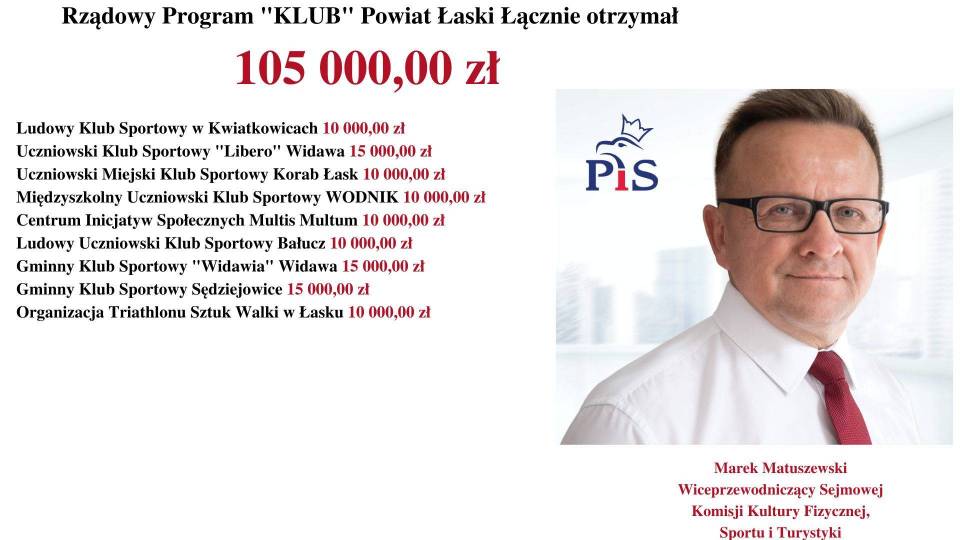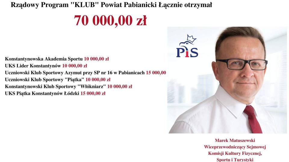 - Rządowy Program „KLUB" skierowany jest do dzieci i młodzieży do 18. roku życia. Rząd Prawa i Sprawiedliwości dba o prawidłową kondycję sportową i fizyczną młodzieży - mówi Poseł na Sejm RP, Marek Matuszewski. - Jest mi niezmiernie miło poinformować, że wśród tak dużej liczby beneficjentów, dofinansowanych przez Rząd Prawa i Sprawiedliwości (MSiT) znalazły się również kluby z województwa łódzkiego.