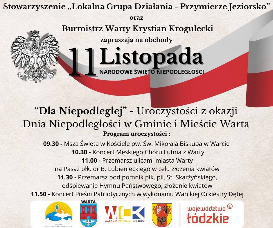 Stowarzyszenie "Lokalna Grupa Działania-Przymierze Jeziorsko" oraz Burmistrz Warty Krystian Krogulecki zapraszają na obchody 11 listopada Narodowe Święto Niepodległości.