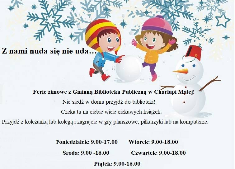 Z nami nuda się nie uda, czyli ferie zimowe z Gminną Biblioteką Publiczną w Charłupi Małej. Nie siedź w domu, przyjdź do biblioteki!